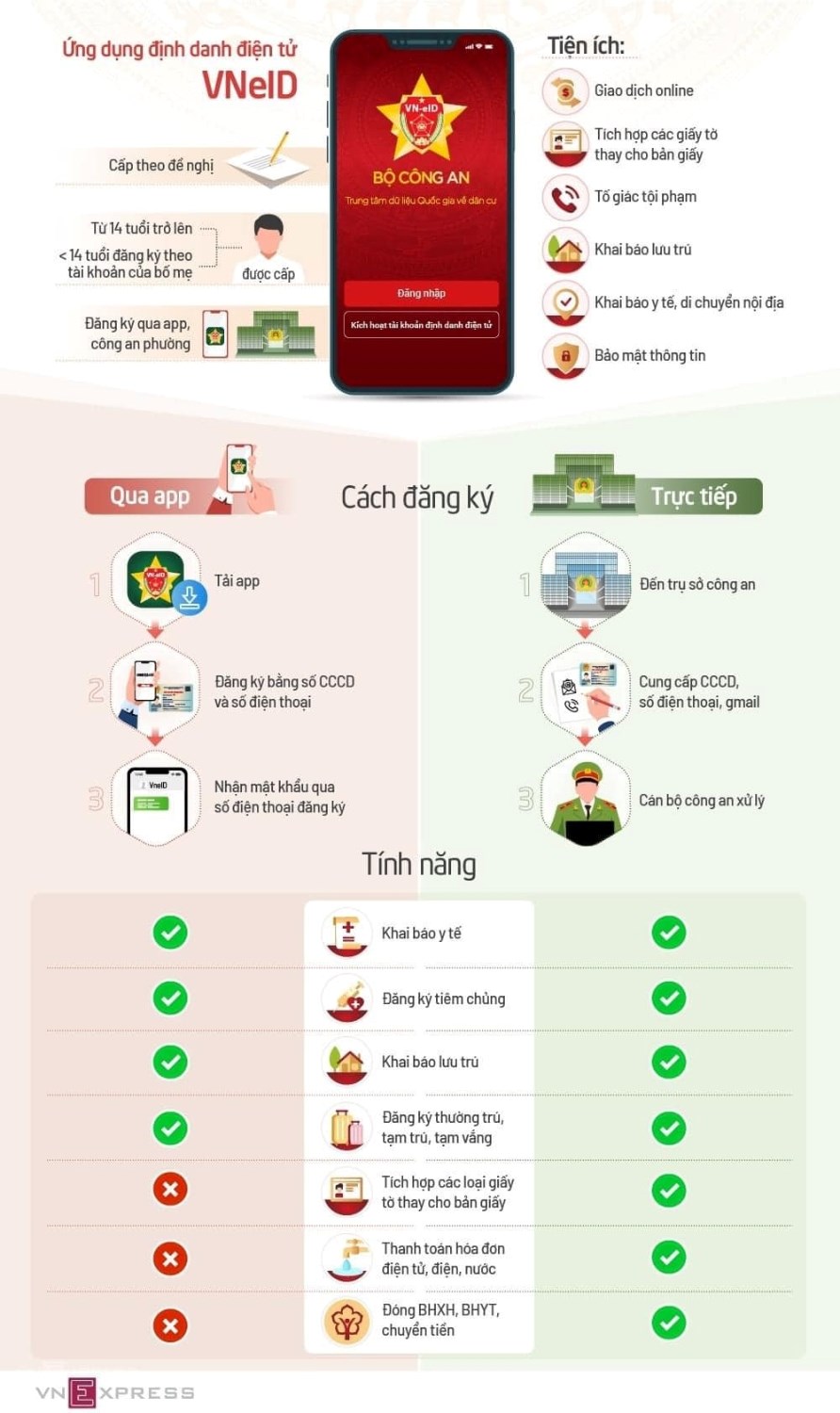 2. Các tính năng nổi bật: Ví giấy tờ, thông báo lưu trú, tố giác tội phạm…giúp công dân có thể thay thế CCCD gắn chíp và các loại giấy tờ đã đăng ký tích hợp hiển thị trên ứng dụng VneID như: giấy phép lái xe, đăng ký xe, bảo hiểm y tế... Như vậy, khi người dân giao dịch hành chính sẽ giảm tối đa các giấy tờ phải mang theo, thực hiện các giao dịch tài chính như thanh toán hóa đơn điện, nước, đóng bảo hiểm xã hội và bảo hiểm y tế, chuyển tiền...