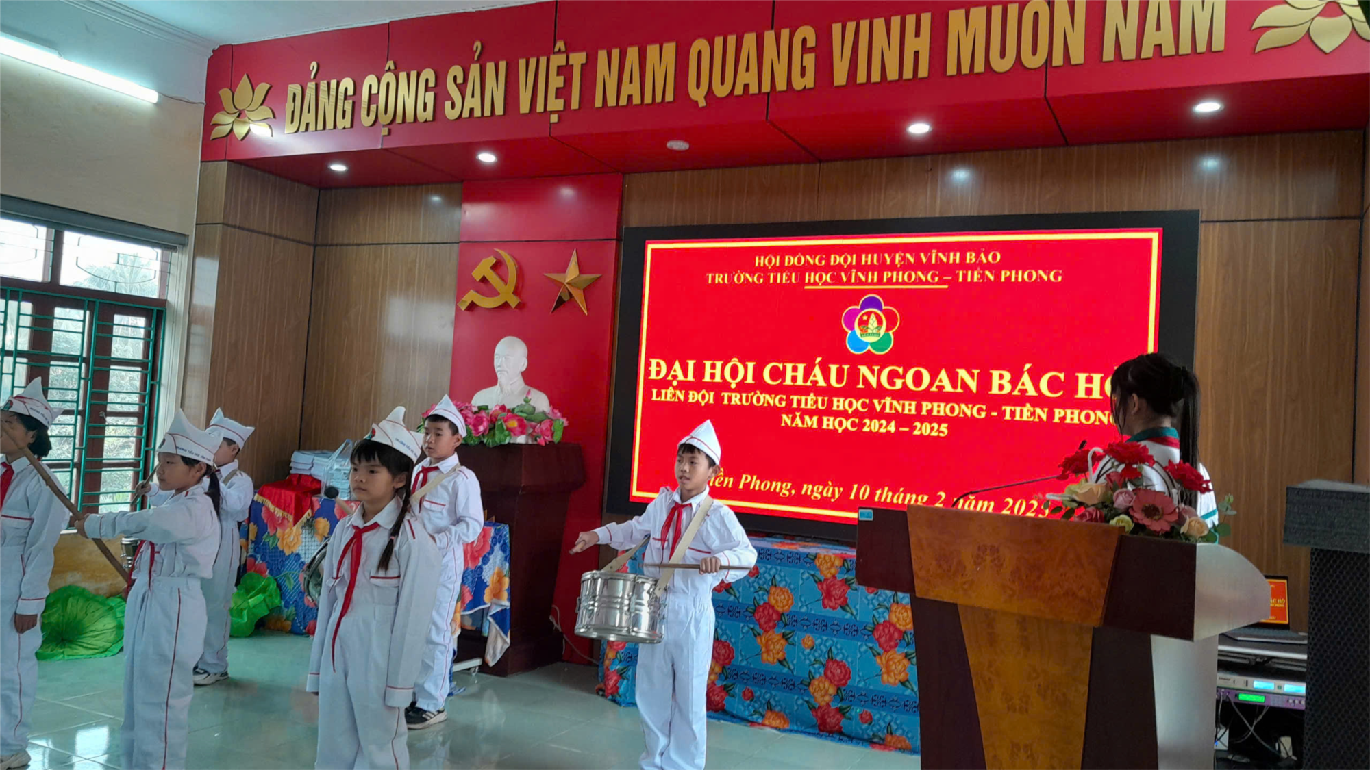 Được sự quan tâm của các cấp các ngành lớp lớp măng non xã Tiền Phong đã nỗ lực phấn đấu vươn lên trong học tập lao động, tham gia các hoạt động do nhà trường và hội đồng đội các cấp phát động. Công tác đội và phong trào thiếu nhi liên đội trong những năm qua đã gặt hái được những thành tích trên tất cả các lĩnh vực, xây dựng tổ chức Đội ngày càng vững mạnh. Đồng thời Đại hội biểu dương những gương mặt tiêu biểu nhất trong vườn hoa “Nghìn việc tốt” của liên đội dâng lên Đảng, Bác kính yêu. Với ý nghĩa đó tôi xin long trọng tuyên bố khai mạc Đại hội cháu ngoan Bác Hồ liên đội Trường Tiểu học Vĩnh Phong – Tiền Phong năm 2025.