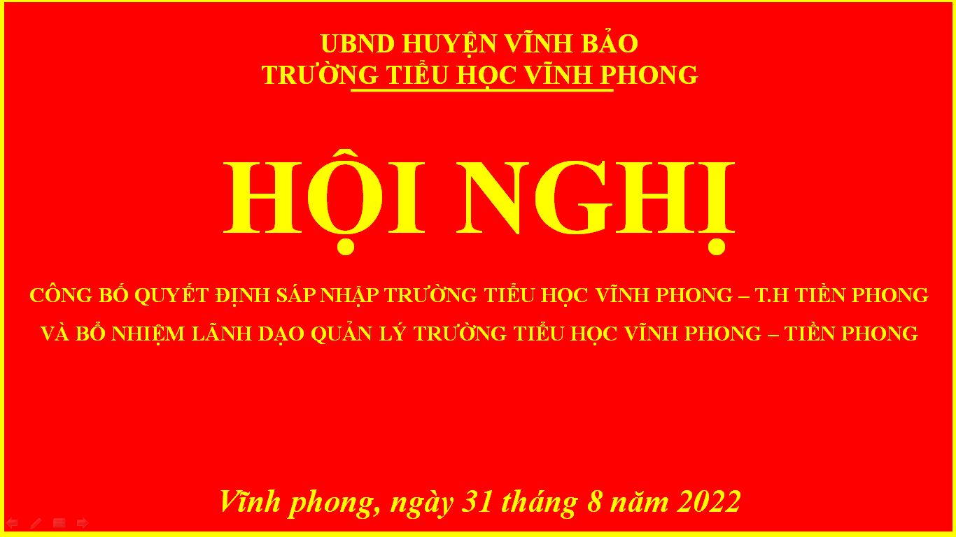 Thông báo: Mời toàn thể các đc CB, GV, NV, đúng 13h30’ chiều thứ tư 31/08/2022 về Hội trường Trường Tiểu học Vĩnh Phong, dự Hội nghị công bố sáp nhập Trường Tiểu học Vĩnh Phong – Tiểu học Tiền Phong và bổ nhiệm lãnh đạo quản lý Trường Tiểu học Vĩnh Phong – Tiền Phong. Trân trọng!