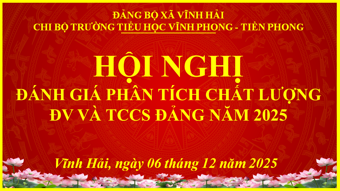 Thực hiện Hướng dẫn và Kế hoạch của Đảng ủy xã Vĩnh Hải về việc đánh giá, phân tích chất lượng tổ chức cơ sở đảng và đảng viên năm 2025, chiều ngày 6/12/2025, Chi bộ Trường Tiểu học Vĩnh Phong – Tiền Phong đã tổ chức Hội nghị đánh giá, phân tích chất lượng Đảng viên và tổ chức cơ sở Đảng năm 2025.