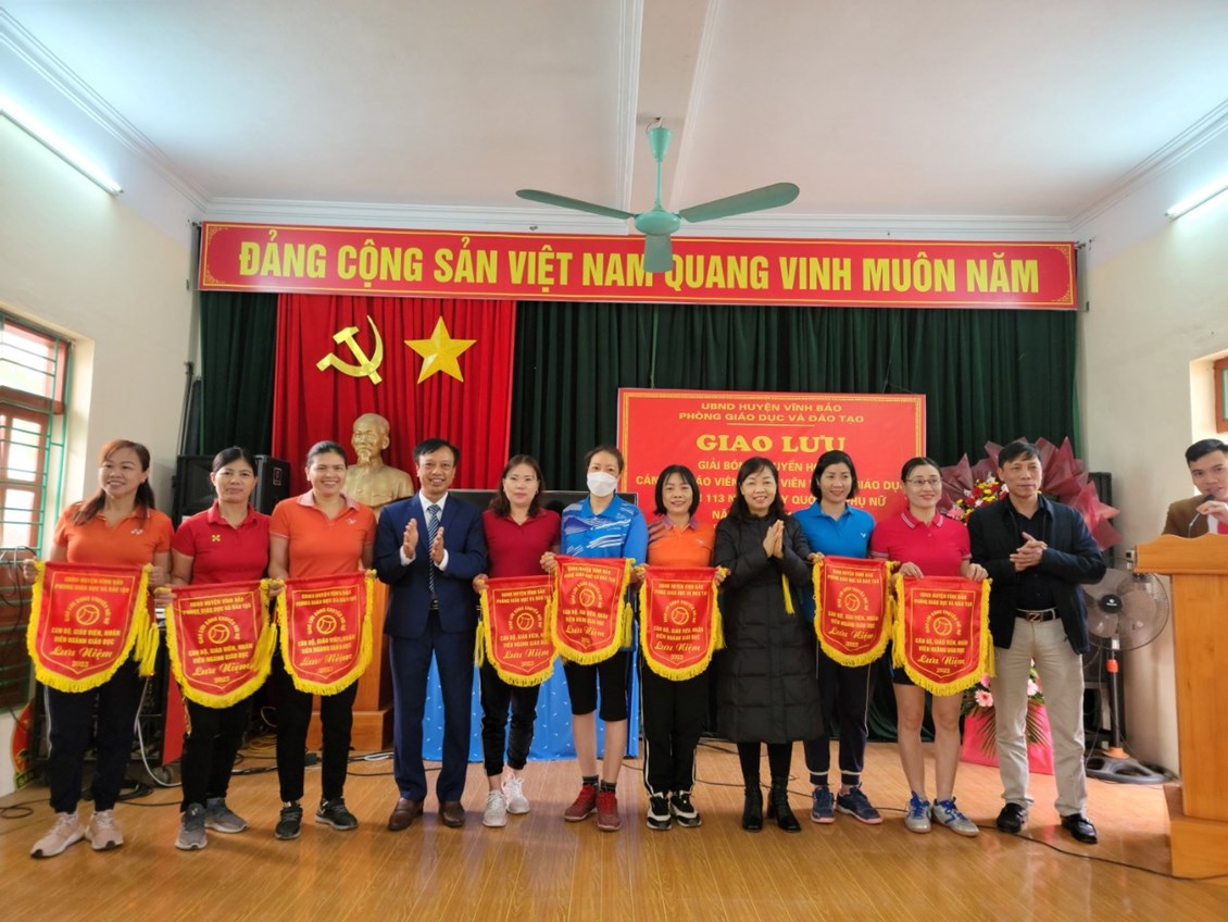 (Lãnh đạo phòng giáo dục trao cờ lưu niệm cho các đội bóng)