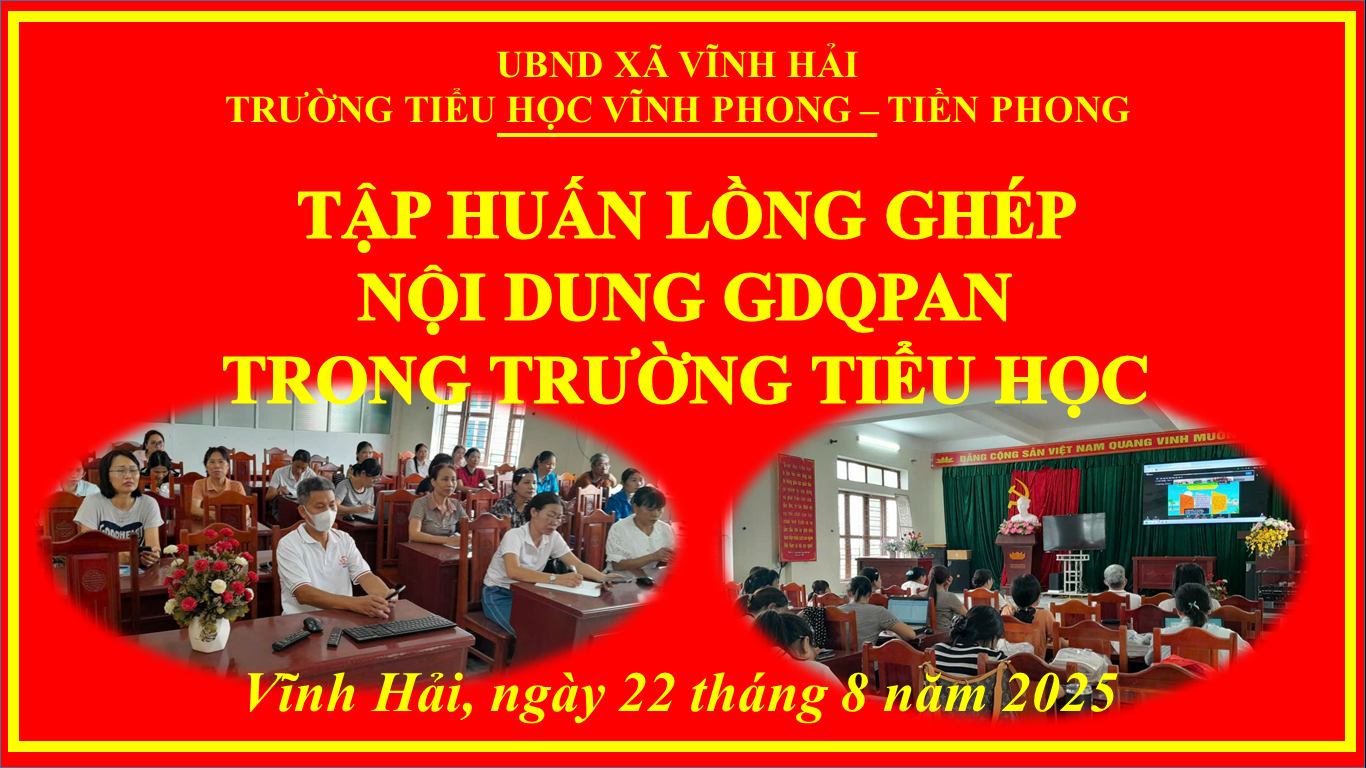Thực hiện kế hoạch năm học 2025 – 2026, nhằm nâng cao nhận thức, kỹ năng và phương pháp lồng ghép nội dung Giáo dục Quốc phòng – An ninh (GDQPAN) vào các môn học và hoạt động giáo dục ở bậc Tiểu học, đội ngũ giáo viên Trường Tiểu học Vĩnh Phong – Tiền Phong đã tham gia lớp tập huấn chuyên đề do Sở Giáo dục và Đào tạo Hải Phòng tổ chức.
