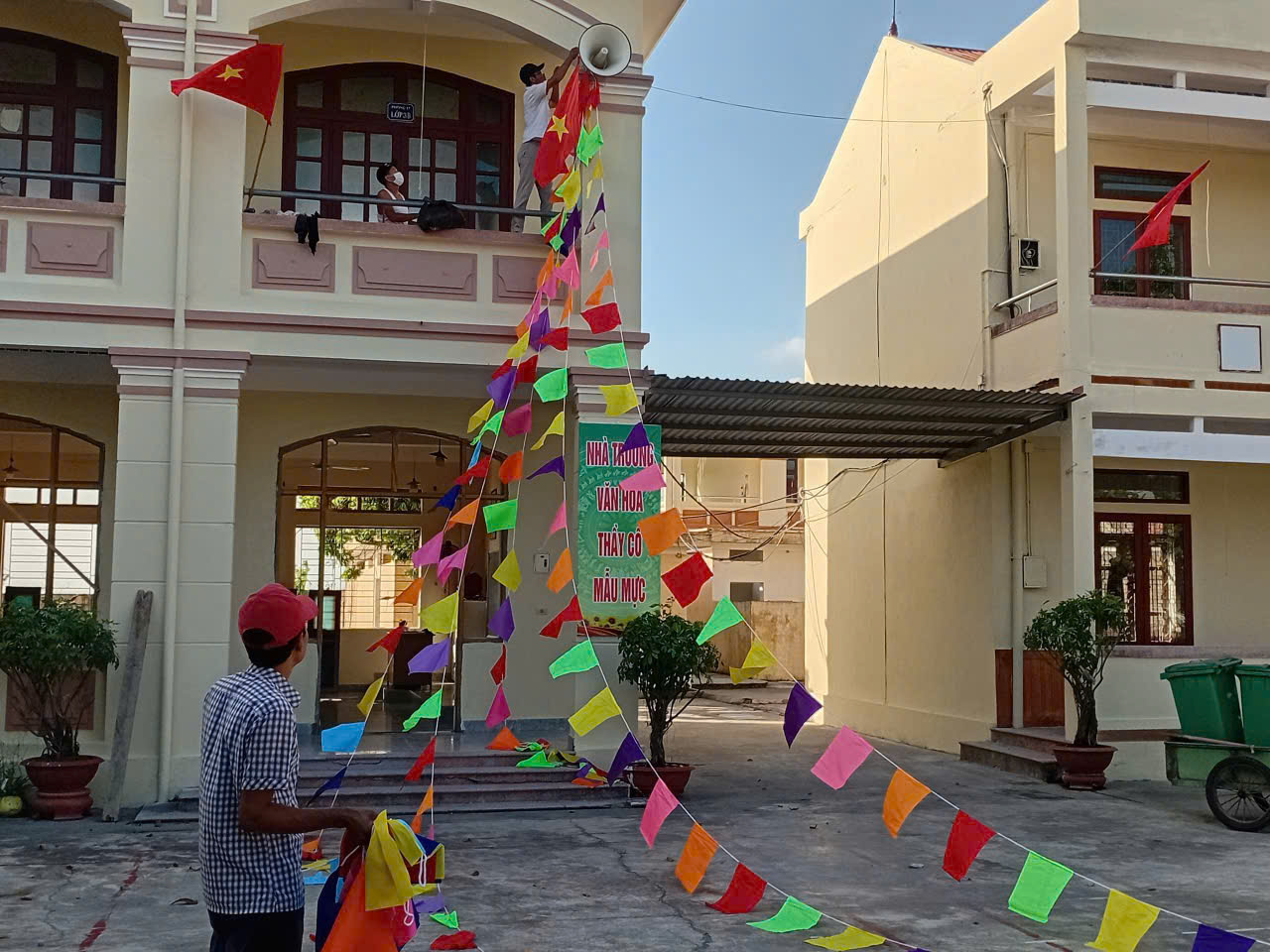 Khắp các dãy lớp học, sân trường, văn phòng đều được chỉnh trang sạch đẹp, trang nghiêm và đầy màu sắc. Lá cờ đỏ sao vàng tung bay phấp phới, băng rôn, khẩu hiệu nổi bật thể hiện niềm tự hào dân tộc và quyết tâm thi đua dạy tốt – học tốt trong năm học mới.