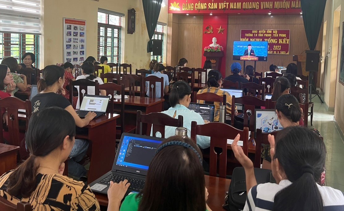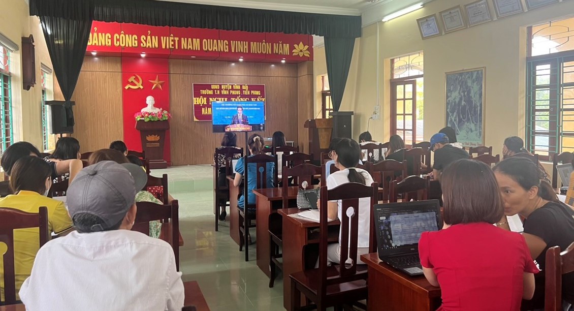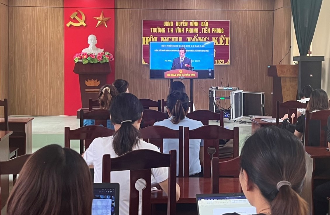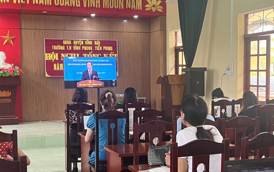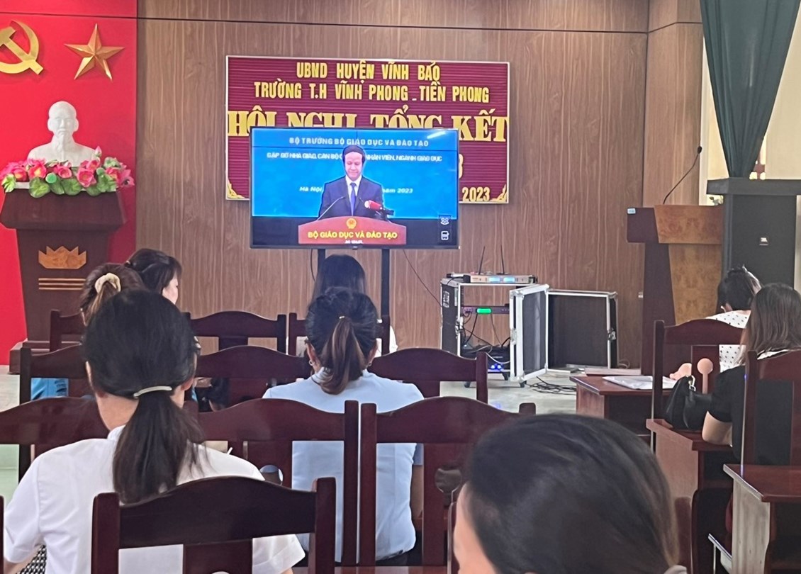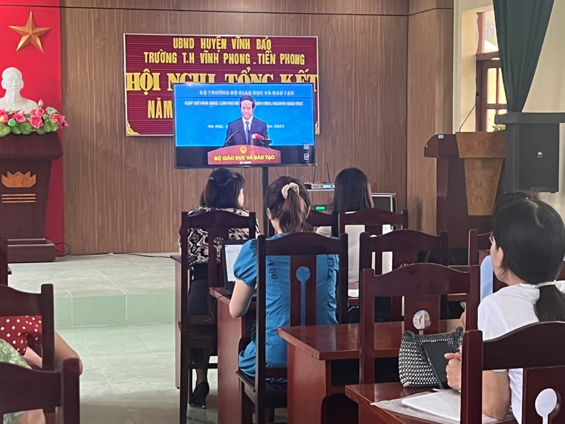 Sáng ngày 15/8, cùng hàng triệu giáo viên trên cả nước, giáo viên trường Tiểu học Vĩnh Phong - Tiền Phong đến điểm cầu của trường để sẵn sàng cho chương trình Bộ trưởng gặp gỡ nhà giáo, cán bộ quản lý, nhân viên ngành GD&ĐT năm 2023. Đây là lần đầu tiên Bộ trưởng Bộ GD&ĐT đối thoại trực tuyến với giáo viên. Nhà giáo, cán bộ quản lý.
