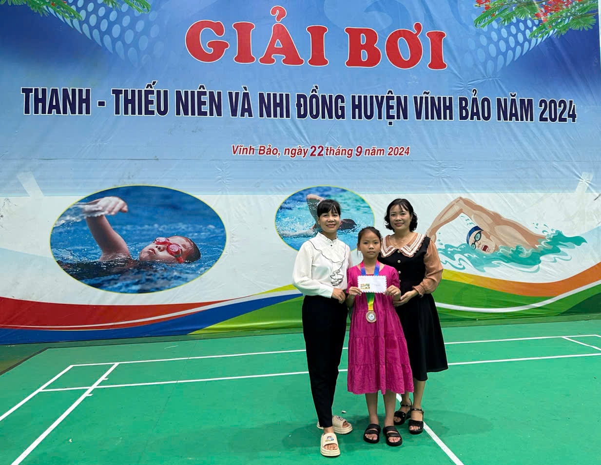 Thực hiện Kế hoạch số 246/KH-UBND ngày 13/8/2024 của UBND huyện Vĩnh Bảo về việc tổ chức giải Bơi Thanh, thiếu niên và nhi đồng huyện Vĩnh Bảo năm 2024, chiều ngày 22/9/2024 tại Bể bơi Nhà thi đấu - Trung tâm Văn hóa, Thông tin và Thể thao huyện Vĩnh Bảo. Trường Tiểu học Vĩnh Phong – Tiền Phong có 8 VĐV tham gia thi bơi ở các nội dung. Ở nội dung bơi 25m Ếch nữ, VĐV Phạm Ngọc Ánh lớp 4C trường Tiểu học Vĩnh Phong – Tiền Phong đã giành huy chương Đồng mang về cho trường.